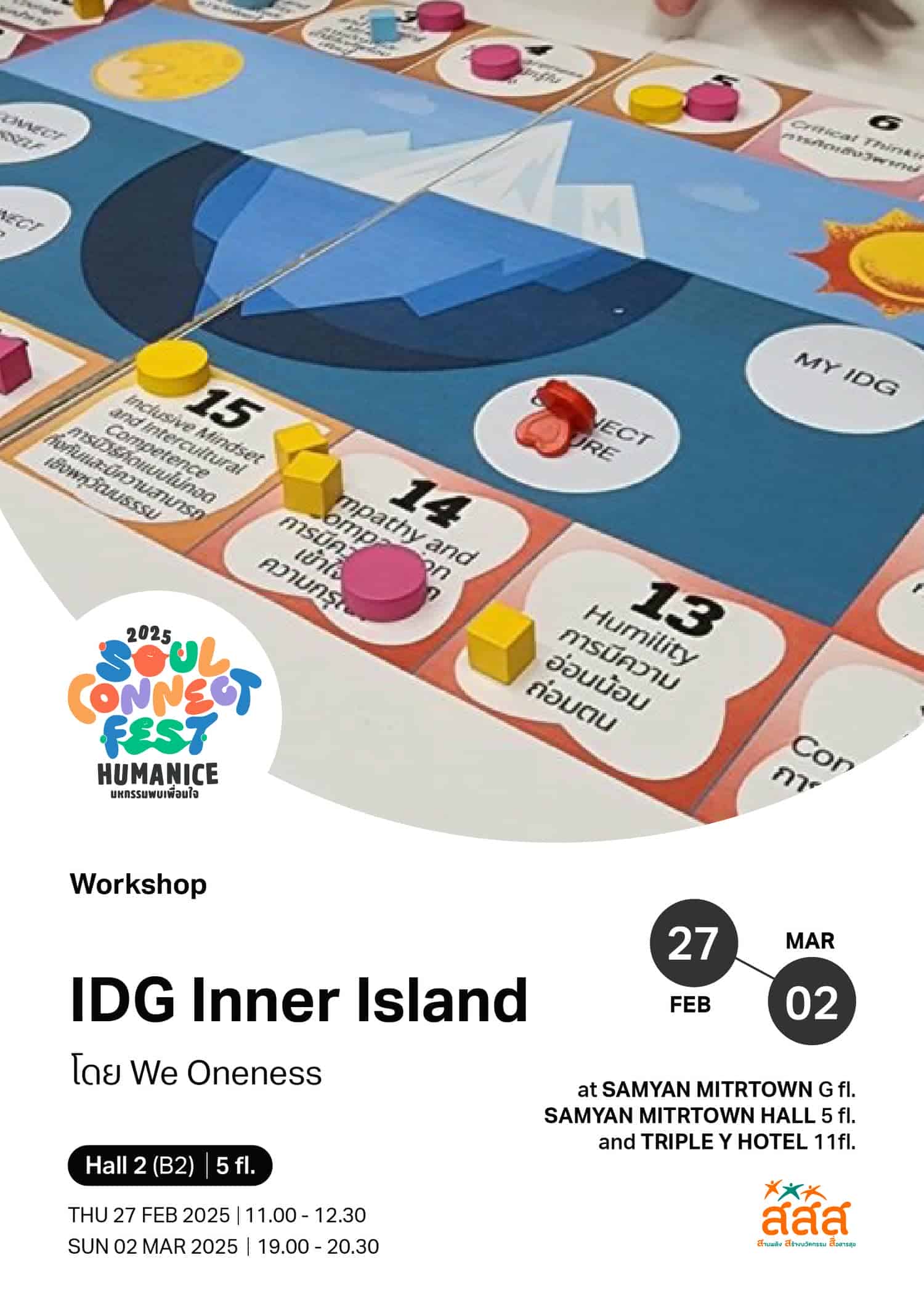 สำรวจและทำความเข้าใจตัวเองผ่านมุมมอง 5 มิติ 23 ทักษะของ Inner Development Goals (IDG) เพื่อเชื่อมโยงกับตัวตนภายใน เข้าใจความคิด อารมณ์ และความต้องการที่แท้จริง พร้อมสร้างพื้นที่ปลอดภัยสำหรับการเติบโตทางจิตใจ ผ่านการเล่นบอร์ดเกม IDG ที่กระตุ้นการสำรวจจุดแข็ง จุดอ่อน ทบทวนมุมมองต่อชีวิตและความสัมพันธ์กับผู้อื่น ผู้เข้าร่วมจะได้แลกเปลี่ยนเรื่องราวผ่านการ์ดและวงสนทนา ในพื้นที่ปลอดภัยที่เต็มไปด้วยความเข้าใจและการสนับสนุนซึ่งกันและกัน