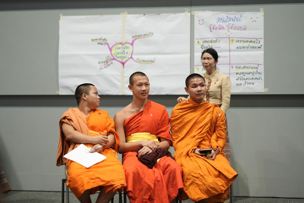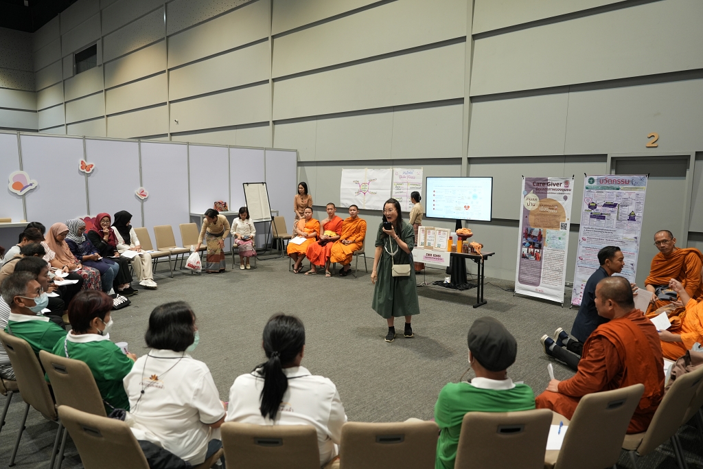 มาเรียนรู้วิธีการดูแลใจผู้ป่วยติดเตียงและผู้สูงอายุในชุมชน ผ่านการสื่อสารเชิงบวก จากสามเณรโรงเรียนเชียงกลางปริยัติศึกษา จ.น่าน ที่นำเสนอแนวทางการเยี่ยมเยือนให้กำลังใจผู้ป่วย โดยใช้เครื่องมือทางศาสนา เช่น บทสวด สายสิญจน์ และอื่น ๆ วิธีการพูดคุยสร้างแรงใจให้ครอบครัวผู้ป่วย โดยผู้เข้าร่วมจะได้เรียนรู้และมีส่วนร่วมในกระบวนการนี้ เพื่อเสริมสร้างความเข้าใจ นำไปปรับใช้ในการดูแลและให้กำลังใจแก่ผู้อื่นในชีวิตประจำวัน